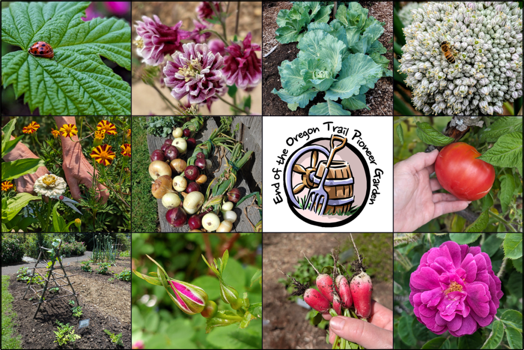 Welcome to the End of the Oregon Trail Pioneer Garden at Abernethy Green.  Walk back in time and experience the simple delights the first settlers in Oregon experienced as they saw their gardens begin to bear fruit, vegetables and flowers.  The varieties of plants that you see in the demonstration garden are representative of varieties grown in the 1840 to late 1880’s.